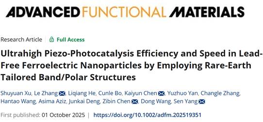 上述研究成果近期以《Ultrahigh Piezo-Photocatalysis Efficiency and Speed in Lead-Free Ferroelectric Nanoparticles by Employing Rare-Earth Tailored Band/Polar Structures》为题,发表于国际权威期刊《Advanced Functional Materials》。成人直播