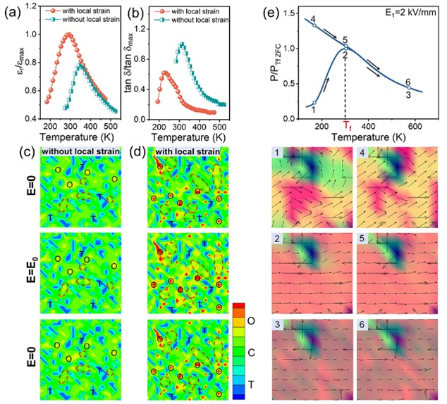 研究发现,在特定组分中引入Hf⁴⁺取代Ti⁴⁺所产生的局域应变场,能够调控形成5–10 nm的条带状C–T–O玻璃态共存结构,促使局域晶格畸变显著增大,并降低该区域的自发极化强度。相场模拟进一步证实,该策略可促使产生更多具有可逆畴翻转能力的O相纳米畴,从而将介电常数提高25%,介电损耗降低38.8%。同时,在冻结温度附近的热稳定窗口内,材料能维持高极性动力学并抑制高温退极化场的影响,实现宽温域下的高性能输出。最终,在保持超低损耗(<5%)的基础上,将极化强度提升20.8%,应变幅值提升34.2%,并在23 K温区内获得优异介电性能(εr/tan δ ~ 9.9×10⁵)。这一结果为开发高性能脉冲能量发生器、机电执行器等电子器件提供了新材料思路。