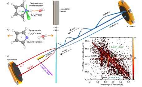 任雪光教授团队与吉林大学丁大军教授团队联合海外研究人员,利用电子碰撞和强场飞秒激光电离技术,通过发展水合生物分子团簇束源和多粒子符合动量成像方法,实现了电子态分辨测量及团簇结构和动力学超高时空分辨谱学研究,揭示了水合生物分子体系中分子间超快质子转移机制。研究发现当内壳层电离的生物分子通过俄歇过程发生双电离后,能够与邻近水分子发生分子间质子转移。以水合吡咯二聚体为例,吡咯分子在双电离后靠近邻近的水分子,将构成N-H…O氢键的质子转移到水分子上,形成去质子化的C4H4N+和水合氢离子H3O+后发生库仑爆炸。研究表明上述反应通道是一个无势垒过程且发生在50-60飞秒时间尺度,是迄今为止发现的最快的酸-碱反应。上述研究工作揭示了电离激发诱导的分子间质子转移新机制,为理解生物辐射损伤提供了新思路。