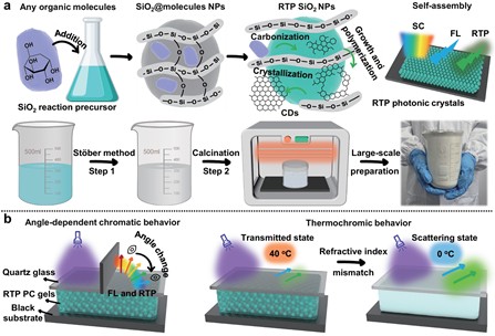 该研究相比于传统磷光材料和光子材料具有三大创新突破:首先,通过将多样化有机小分子引入二氧化硅网络,并借助高温煅烧实现原位碳化、聚集与结晶,形成磷光碳点,成功实现了单分散磷光二氧化硅纳米球的规模化制备,单批次产量>700 g。其次,利用纳米球所形成的PC凝胶中物理周期结构产生的光子带隙的角度依赖性,基于光子-物质相互作用,首次实现结构色/荧光/磷光的协同变色。最后,热依赖的光散射能力可调控自身荧光和磷光发射强度,分别增强了128倍和87倍,磷光发光寿命延长了25倍。