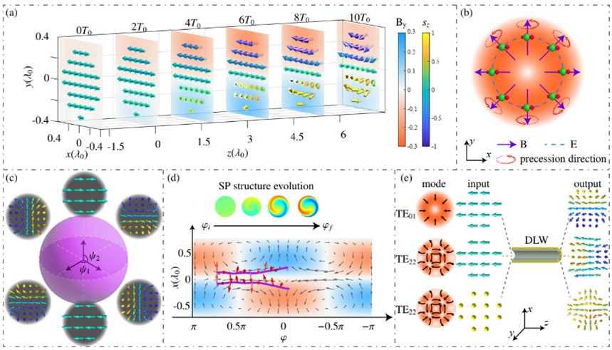 栗建兴教授团队提出并发展了一种在太赫兹波导管中通过极化-模式匹配产生结构极化轻子束的方案。研究表明,当太赫兹电磁模式与轻子束自旋极化态实现空间匹配时,可以在保持束流品质的同时,实现对自旋结构的精确操控。例如,在TE01模作用下,根据轻子束的极化-模式匹配的不同,可以产生“蜘蛛状”、“螺旋型”、角向和径向极化等多样化的自旋结构。该研究的核心创新在于将波导中特定电磁模式与轻子束自旋极化状态精确匹配。该方案克服了传统自旋控制技术只能在纵向和横向极化间切换的局限,实现了在皮秒尺度的自旋操控,还可以有效抑制束流发散和能散,保持束流品质。该方案基于现有太赫兹技术条件,参数可行性高,且适用于电子、缪子、陶子等多种轻子束。团队通过理论模拟与参数优化,系统分析了波导模式、相速度匹配、自旋-磁场夹角等关键因素对自旋结构的影响,还讨论了通过脉冲整形、波导结构设计和轻子束匹配等途径进一步优化的可能性,为实验的实现提供了理论依据。