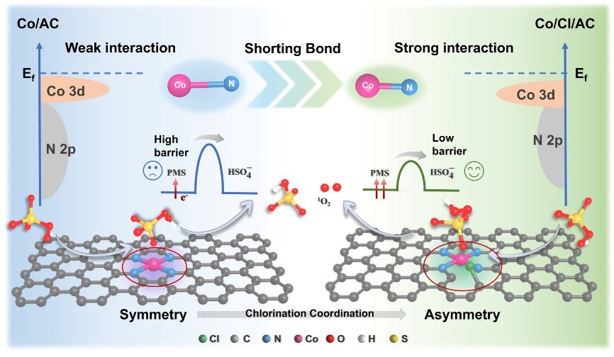 该工作采用平面氯化工程构建了具有不对称Co-N4配位的单原子催化剂,高度分散的Co活性中心与Cl–C配位引起的电子结构变化可以增加活性位点的电子局域密度,优化反应过程中催化剂表面与过硫酸盐分子间的电荷转移速率,并强化反应物分子在催化剂表面的吸附,实现优异的过硫酸盐活化性能和良好的反应稳定性。