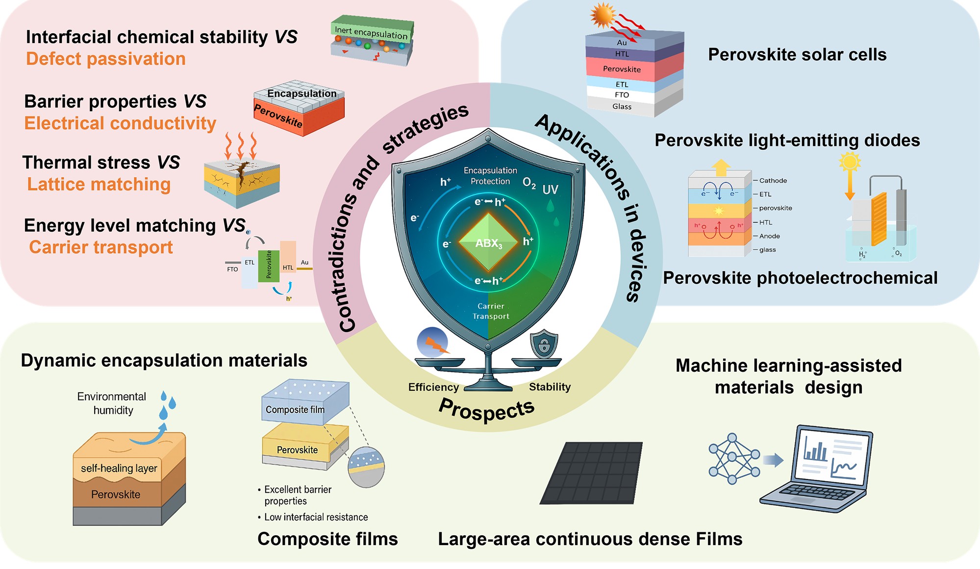 卤化物钙钛矿材料因其优异性能在光电子器件中应用广泛,然而其高效率与稳定性之间的平衡仍是当前面临的重大挑战。该工作系统分析了钙钛矿器件中载流子传输与封装相关的四大关键问题,并提出了相应对策。研究进一步结合钙钛矿太阳能电池、发光二极管及光电化学器件的典型案例,深入探讨了现有挑战与解决路径。最后,研究提出了面向未来的钙钛矿器件设计策略,为推动其实验室成果向商业化转化提供了重要参考。